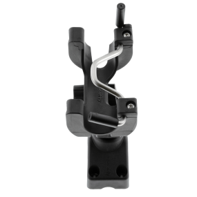 Scotty R-5 Universal Rod Holder med Deck Mount, vår favoritspöhållare! Superenkel att placera/låsa spöt och likaså ta ur det. Man för bara spöt med rulle mot låsningen hela vägen ner så sitter det. För att lossa drar man rakt upp samma väg. Spöt kan ej glida ur, minsta press på linan eller klingan låser ännu hårdare.